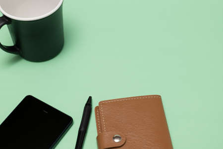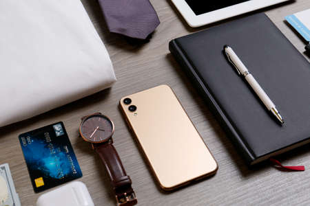 Financial Planning background Concept. Top view of Financial Planing application on smartphone with business reports graph chart, credit card, and businessman accessories on grunge wooden background.