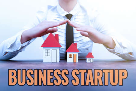 Text sign showing Business Startup. Word Written on Putting up new commerce venture Fresh Undertaking New home insurances and coverages plans represeneted by lady