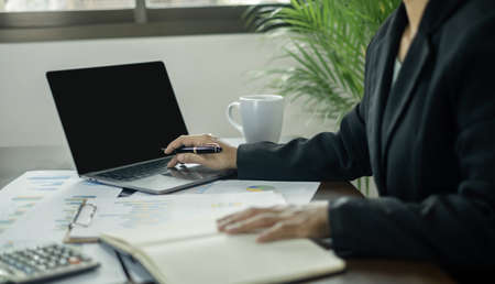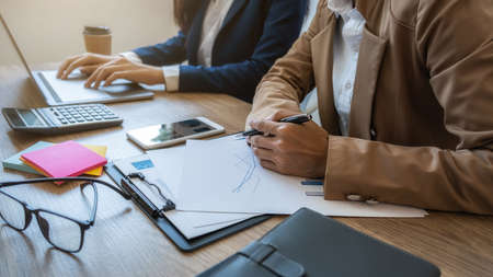 The businesswoman hand sits at their desks and calculates financial graphs showing the results of their investments planning the process of successful business growth.
