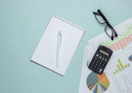 Economic analysis, Statistic, analytics. Calculator, glasses and notebook, graphs and charts on a blue background. Top view