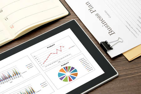 business analysis and statistics concept, desk with mixed graphs and charts on notebooks