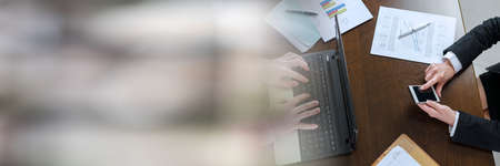 Business team analyzing income charts and graphs with modern laptop computer and using smart phone. Top view close up. Business analysis and strategy concept.