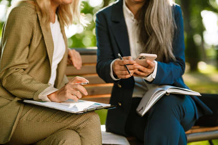 Mature multiracial businesswomen using cellphone while working in park outdoors