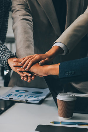 Close-up of group hand success business people person working together in office. Diversity of businessman and businesswoman attending corporate meetings. concept of friendship, cooperation corporate.
