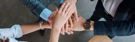 Banner Partners hands together teamwork group of business people meeting in firm company office. Panorama Diversity Hands join empower partner teams connection Mergers acquisitions social community