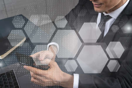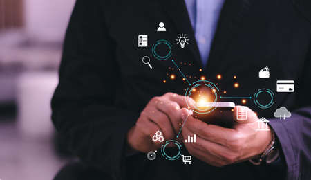 Businessman using mobile smart phone. Business global internet connection application technology and digital marketing, Financial and banking, Digital link tech, big data.