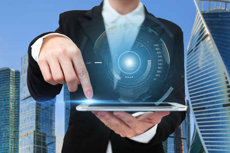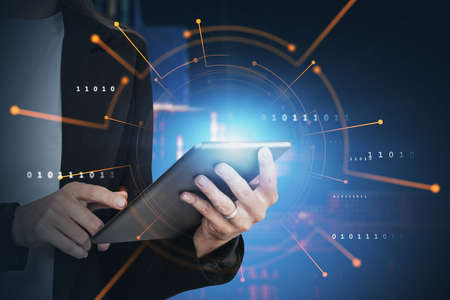 Unrecognizable young businesswoman using tablet computer in abstract city with double exposure of network interface. Toned image