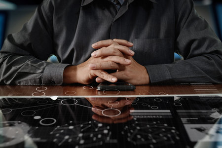 businessman hand working with modern technology digital tablet computer and digital layer effect as business strategy concept