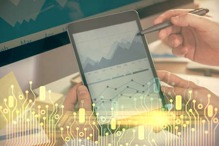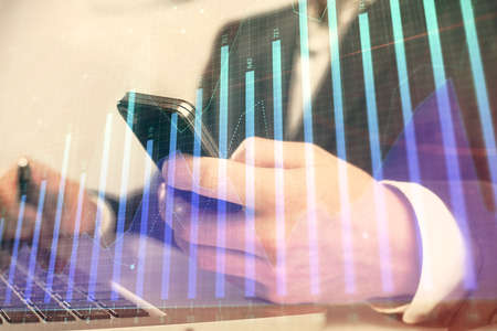 Multi exposure of mans hands holding and using a digital phone and forex graph drawing. Financial market concept.