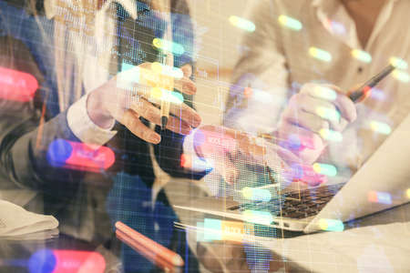 Double exposure of man and woman working together and financial chart hologram drawing. market analysis concept. Computer background. Top View.