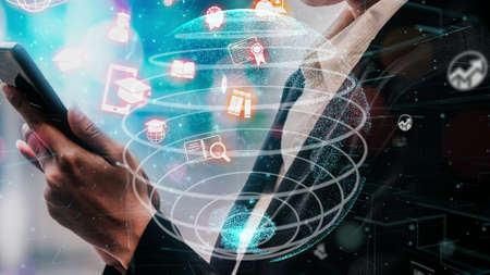 E-learning and Online Education for Student and University conceptual . Graphic interface showing technology of digital training course for people to do remote learning from anywhere.