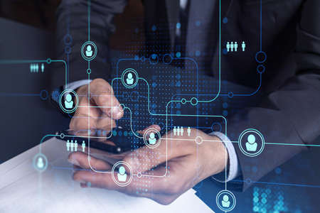 close up of businessman working with mobile phone on wooden desk in modern office with virtual icon diagram
