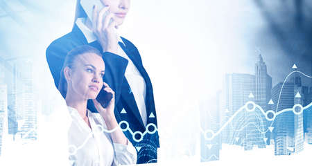 Businesswoman talking phone, business people and candlesticks forex changes and bar chart, colleagues negotiations, double exposure. Concept of international corporate finance