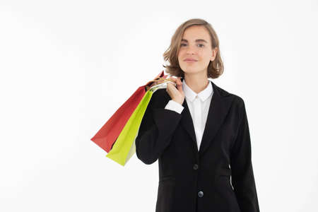 Portrait of young business woman holding shopping bags on white isolated background.