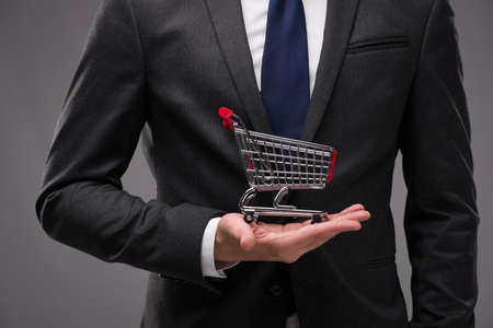 Businessman with shopping cart on gray background