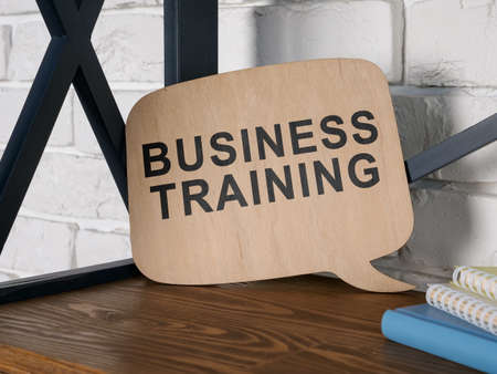 Big wooden plate with words business training on the shelf.