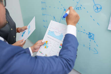 Close-up shot of unrecognizable managers drawing business graph on blackboard while analyzing statistic data during working meeting at modern office