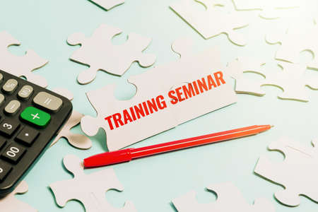 Hand writing sign Training Seminar. Word Written on Academic instruction Formal presentation of a research Building An Unfinished White Jigsaw Pattern Puzzle With Missing Last Piece