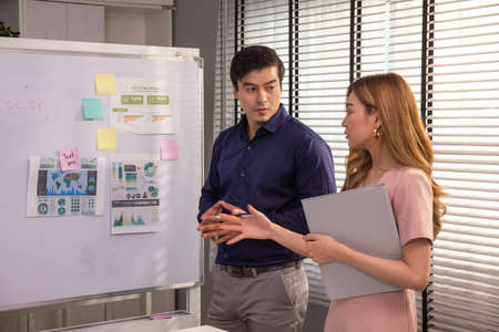 Asian and caucasian ethnicity partnership businesspeople discuss a business plan together in the meeting room in office. Co-worker colleague and teamwork concept.