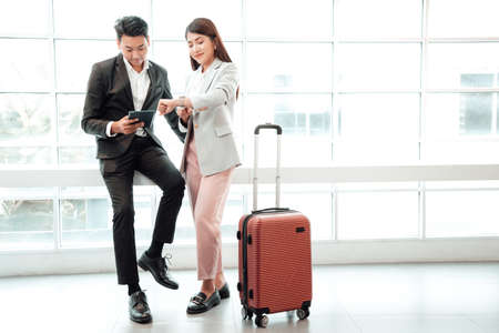Business couple standing together with baggage and checking time near the window at the departure area at the airport
