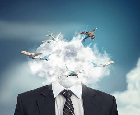 Business man with a clound in place of his head and few airplans flying through the cloud.