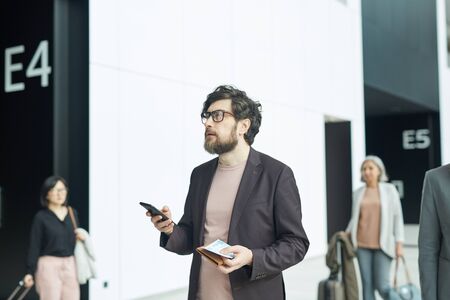 Having a flight. A man holding a boarding pass while travelling