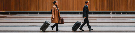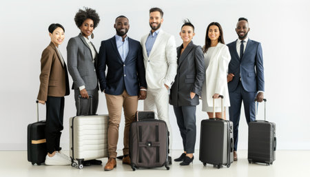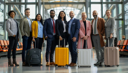Multicultural business professionals of all ages and genders at airport with luggage