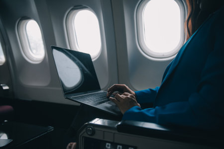 Using mobile and laptop, Thoughtful asian people female person onboard, airplane window, perfectly capture the anticipation and excitement of holiday travel. chinese, japanese people.