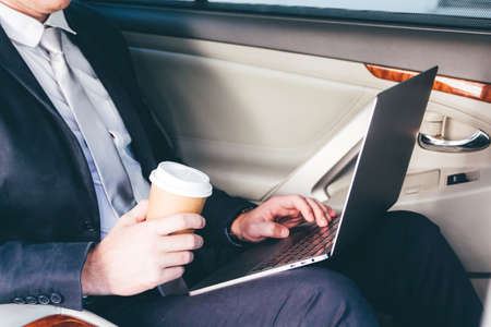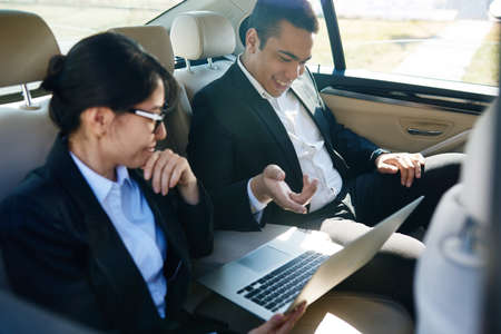 Young businessman talking to his secretary in a car