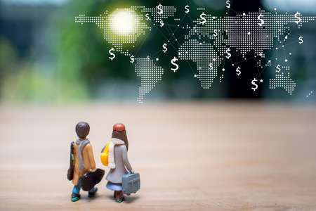 Travelling concepts. Two of miniature mini figures with bag standing go to make money in the world