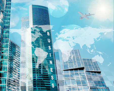 Business center with world map and earth on blue sky background
