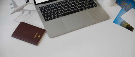 Passport black cover with flight ticket near the laptop computer and white airplane toy on wooden desk with copy space, top view. Online ticket booking for travel concept.