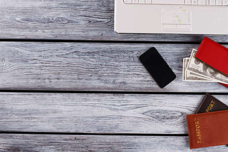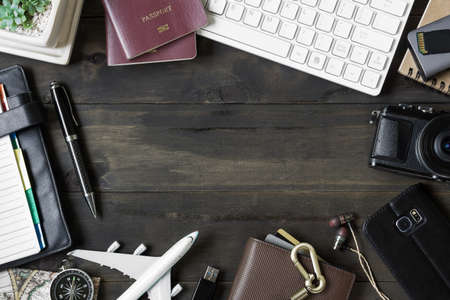 Travelling planing trip concept. Accessories on wood background. Pc keyboard, passport, camera, sd card, usb devices, smartphone and airplane model. Top view with copy space