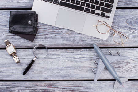 Airplane model with laptop computer on wooden table. Composition with toy plane and laptop on wooden table. For planning travel trips concept. Globalization, business, handling concept.