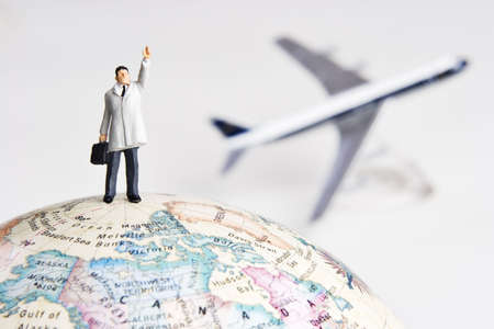 Business figurine on earth globe with toy airplane in background
