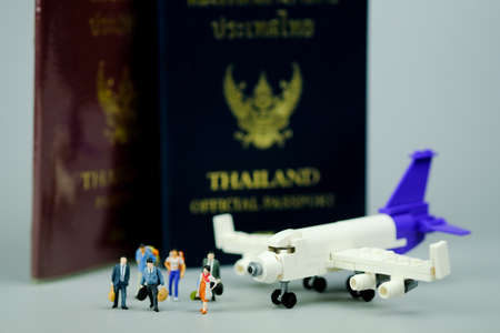 Miniature people businessman in suit and passenger by airline with Thailand passport background. Travel in Thailand