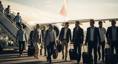 A group of business travelers walking towards an airplane with luggage