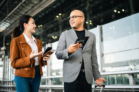 Vacation Trip or business trip . Happy couple love checking ticket the flight information at Airport Terminal