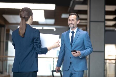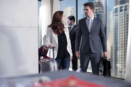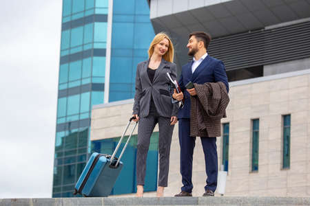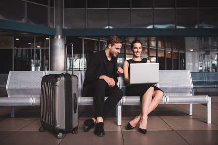 Before the flight. Elegant woman and man working in the airport