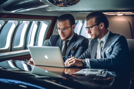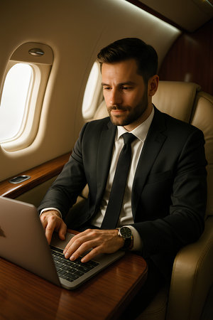 Businessman working on a laptop inside a luxury private jet. Concept of success, productivity, and executive lifestyle during business travel.