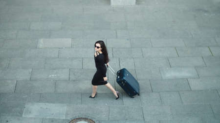 Side view elegant woman walking with suitcase at street. Confident businesswoman wearing sunglasses outdoor. Beautiful business woman looking away in black dress at airport.