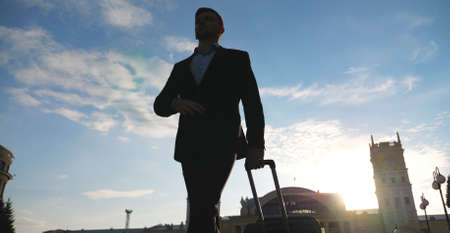 Businessman walking at urban environment with his luggage. Confident manager going to terminal with beautiful cityscape and sunset at background. Successful man going to home after flight. Slow motion