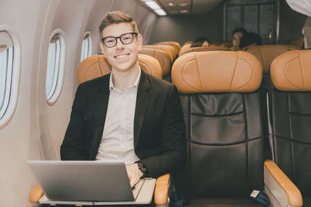 Smiling Business man happy using laptop in cabin flight travel in economic class.