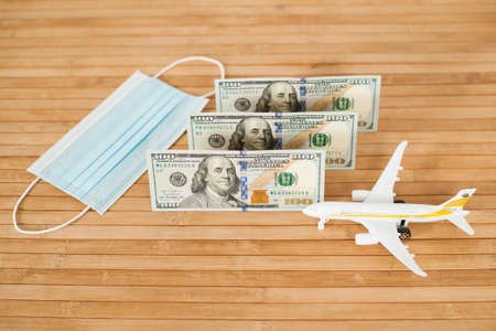 Plane model, face mask and and US dollars money on a wooden background with copy space. resumption of flights. opening of international flights after concept of coronavirus (COVID-19).