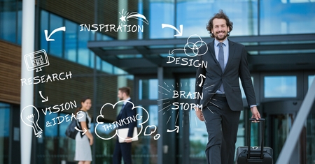 Digital composite of Various icons and text with businessman walaking against building
