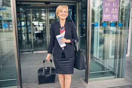 Close up of beautiful businesswoman looking away and smiling while holding airplane ticket and passport
