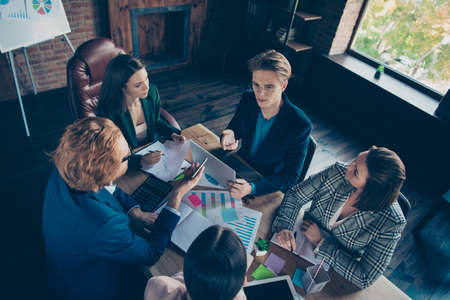 Top above high angle view of nice chic elegant beautiful focused serious expert specialist discussing problem growth result dialog table desk charts data at industrial loft interior work place station