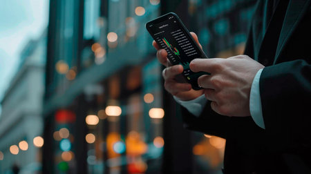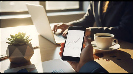 Investor's hand interacts with a stock trading app on a smartphone amidst a blurred office backdrop, emphasizing financial analysis and decision-making. the image highlights the convergence of technology and finance in a professional environment.