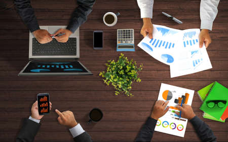 Top view on a group of businessman and businesswoman having a meeting and making a business commitment.