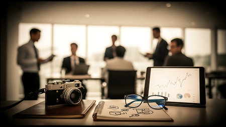 Conceptual vision of business people in corporate staff meeting . Concept of digital technology for marketing data analysis and investment decision making .